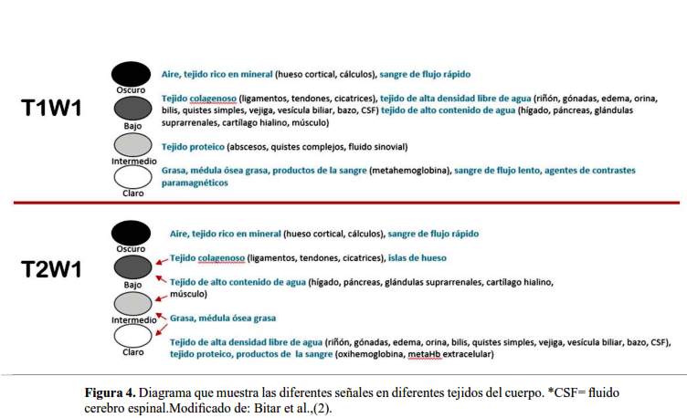En la figura 4 se presenta un diagrama donde nos muestra la intensidad de señal de varios tejidos en T1 y T2, debemos notar que, la señal del tejido proteico varía de acuerdo a la variedad proteica del contenido; los tejidos con alta concentración de proteína deben tener una señal alta en T1 y una señal baja en T2 (2). La secuencia T1 muestra muy bien la anatomía y si se utiliza un medio de contraste también muestra lo patológico, sin embargo, T2 muestra muy bien lo patológico, ya que muchos procesos patológicos contienen gran cantidad de agua y son estas áreas que aparecen brillantes en T2 (2,3).