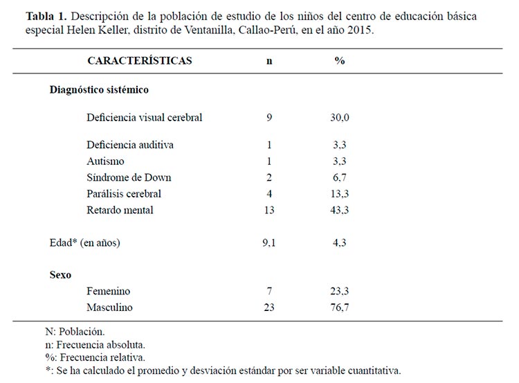 De los 30 niños del centro de educación básica especial Helen Keller, la condición de retardo mental (43,3%, n=13), fue el diagnóstico sistémico más prevalente, por el contrario el menos predominante fue el autismo (3,3%, n=1) y deficiencia auditiva (3,3%, n=1). La edad promedio fue de 9.1 años, con una desviación estándar (DE) de 4,3. Además, el 76,7% (n=23) fueron de sexo masculino y el 23,3% (n=7) del sexo femenino (tabla 1).