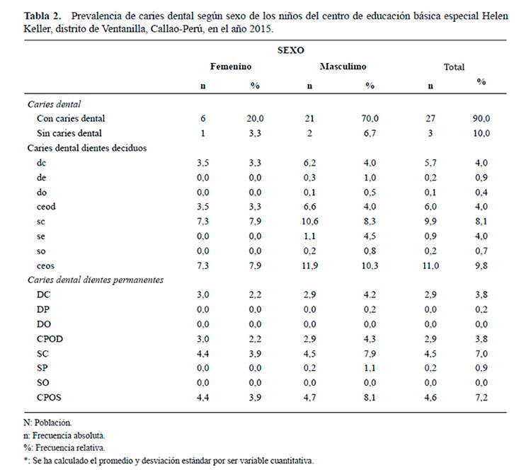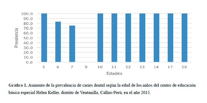 En este estudio encontramos que la prevalencia de la caries dental fue de (90%, n=27), mayormente en el sexo masculino (70%, n=21) en el centro de educación básica especial Helen Keller, localizado en el Callao, Perú durante el 2015.