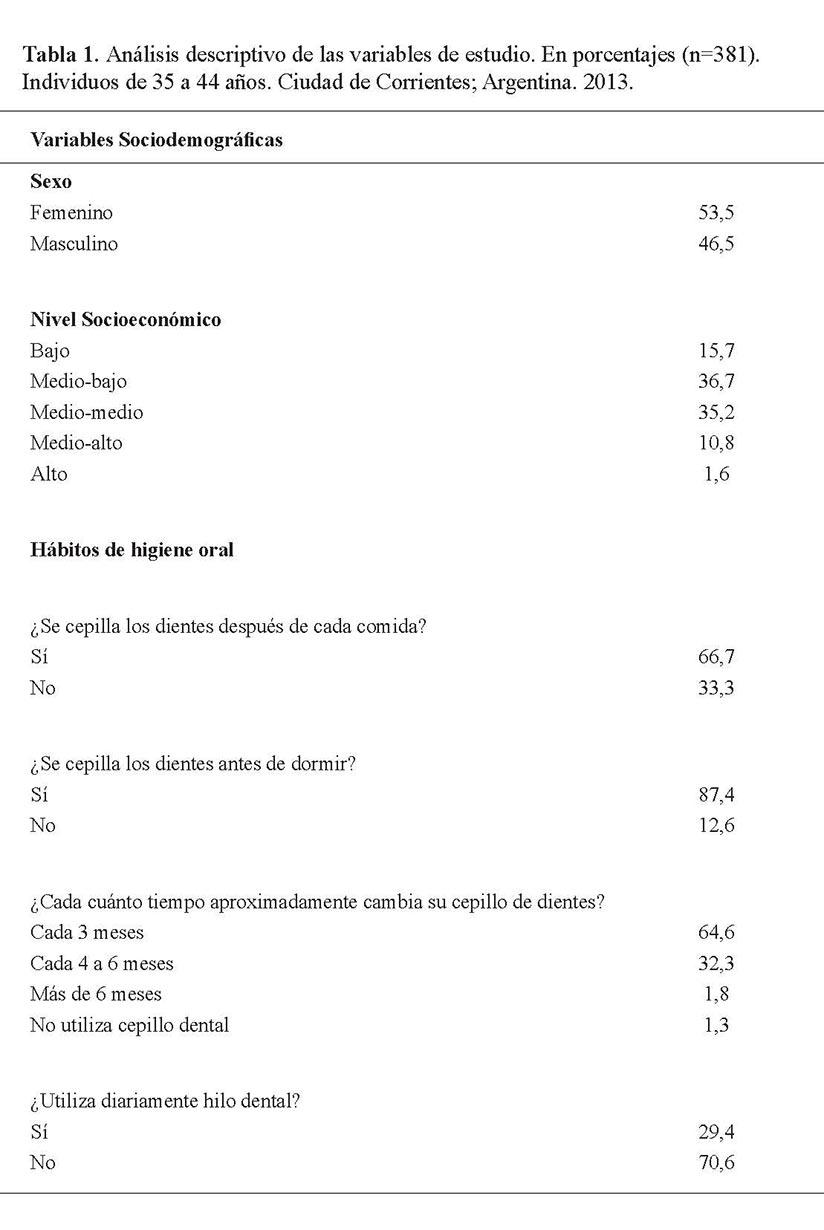 Este estudio se propone describir los hábitos de higiene bucal de individuos adultos que viven en la ciudad de Corrientes (Argentina) y determinar la influencia de variables sociodemográficas (sexo, nivel socioeconómico) y culturales (nivel de conocimientos) en dichos hábitos.