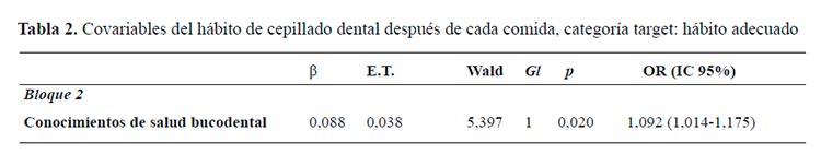 Se consideraron las pruebas ómnibus para los distintos bloques, y se observó que las variables sociodemográficas (sexo y nivel socioeconómico) incorporadas en el primer bloque no aportaban a la predicción del hábito bajo estudio, por lo cual no fueron retenidas en el modelo. No obstante, la variable conocimientos de salud bucodental sí predijo el hábito de cepillado dental.