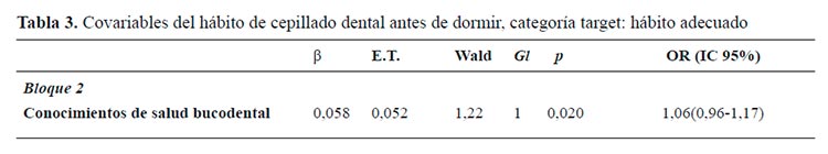 En esta variable, 1 = sí (hábito adecuado), y 0 = no (hábito no adecuado). El modelo no presenta un ajuste aceptable (X2 (1) = 1,205, p < 0,272. Ello indica que las variables incorporadas al modelo no contribuyen a la predicción del hábito de cepillado dental antes de dormir. Las variables sociodemográficas (sexo y nivel socioeconómico) no son retenidas en el bloque 1, y la variable conocimientos de salud bucodental se asocia a un coeficiente ß resulta igual a 0.058, siendo el test de Wald no significativo (test de Wald = 1.222, p < 0,269) (tabla 3).