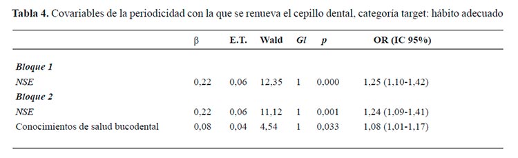 Se consideraron las pruebas ómnibus para los distintos bloques, y se observó que ambos contribuían de manera significativa a la explicación del hábito de regularidad con la que se renueva el cepillo dental (bloque 1: X2 (1) = 13,102, p <0,000; bloque 2: X2 (1) = 4.565, p <0,033).