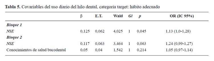 En esta variable, 1 = sí (hábito adecuado), y 0 = no (hábito no adecuado). El modelo final presenta un ajuste no adecuado (X2 (2) = 5,603, p < 0,061), lo cual indica que las variables comprendidas en el modelo final no contribuyen de manera significativa a la predicción del hábito de uso del hilo dental. No obstante, vale señalar que en el bloque 1, la variable NSE evidenció aportar significativamente a la predicción del hábito de uso de hilo dental (test de Wald = 4,025; p <0,045); aporte que perdió significación al ser incluida en el siguiente bloque (test de Wald = 3,464, p < 0,063). La variable conocimientos de salud bucodental se asoció a un coeficiente ß igual a 0.05, siendo el test de Wald no significativo (test de Wald = 1,364, p < 0,214) (tabla 5).