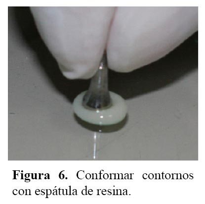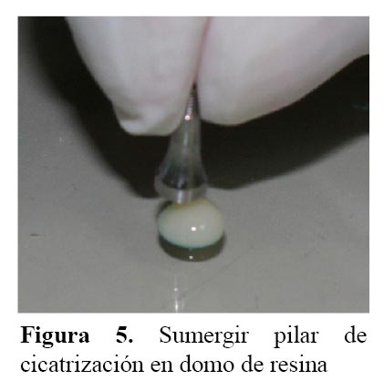 Sobre el domo formado con resina fluida sumergir el pilar de cicatrización previamente arenado y conformar los contornos con una espátula de resina (figura 5 y figura 6).
