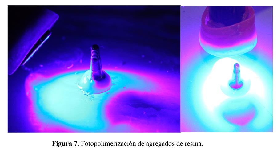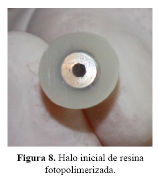 Una vez conformados los contornos alrededor del cicatrizador proceder a fotopolimerizar por todas las superficies (figura 7).