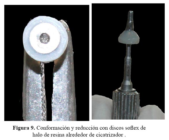 Con la ayuda de discos soflex, realizar el desgaste y contornear el halo alrededor del pilar de cicatrización hasta obtener el diámetro adecuado, asimismo realizar un prolijo pulido de la superficie que entrará en contacto con la mucosa periimplantaria (figura 9).
