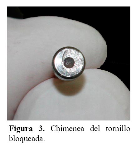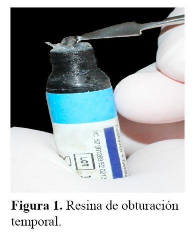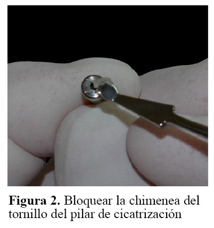 Se bloquea con resina de obturación temporal la chimenea del tornillo correspondiente al pilar de cicatrización, con la finalidad de evitar que ingrese material de obturación definitivo que será utilizado para la conformación alrededor del pilar de cicatrización (figura 1, figura 2 y figura 3) .