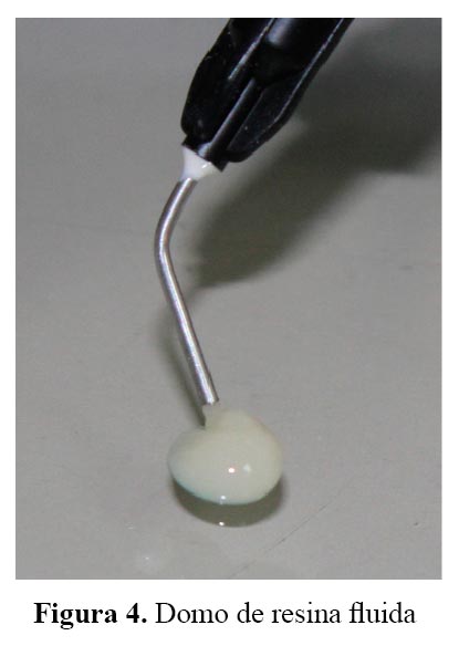 En una platina de vidrio colocar resina fluida formando un domo (figura 4).