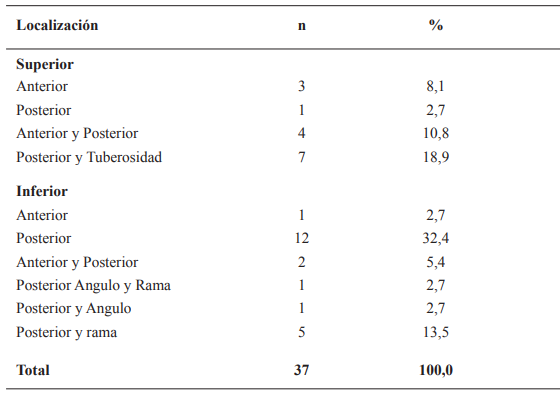 Del total de casos de este estudio el 59,9% se localizó en la mandíbula, esta predilección por el maxilar inferior concuerda con la mayor parte de la literatura (14,15). Las zonas más afectadas en la mandíbula fueron la zona posterior, seguida de la zona posterior y rama, que albergaban el 45,9 % de los casos, esta preferencia por la zona posterior concuerda con la revisión sistemática de 2082 quistes dentígeros de Zhang et al.,(18).