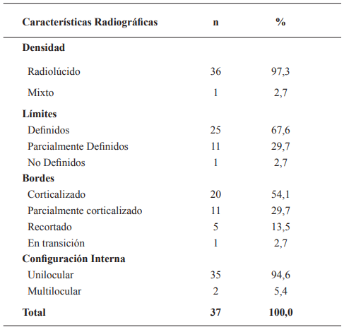 La distribución de las características radiográficas de densidad, límites, bordes y configuración interna se muestran en la tabla 2, figura 2 y figura 3.