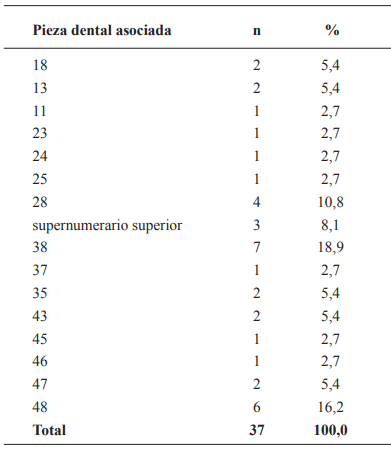 La edad mínima fue de 8 años y la máxima de 75 años, con una edad media de 22,8 años. El quiste dentígero fue más frecuente en mujeres, con 19 casos (51,4%), mientras los hombres representaron 18 casos (48,6%).