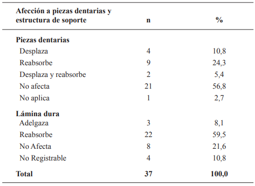 Otra característica evaluada fue el efecto que los quistes dentígeros pueden tener frente a estructuras como las piezas dentales adyacentes, la cortical de la basal mandibular, el conducto dentario inferior, el piso del seno maxilar y la lámina dura.