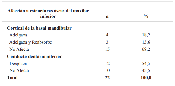 En cuanto al conducto dentario inferior, 12 casos (54,5%) de 22 casos (100%) registrados para este efecto; el quiste dentígero hizo contacto con el conducto dentario inferior produciendo su desplazamiento caudal, dato importante a tener en cuenta ya que Liang et al., mencionan que los pacientes con quistes dentígeros mandibulares pueden presentar parestesia del nervio alveolar inferior producido por la alta presión que generan estos quistes o por la corrosión química de los tejidos nerviosos por factores inflamatorios de los quistes (34).