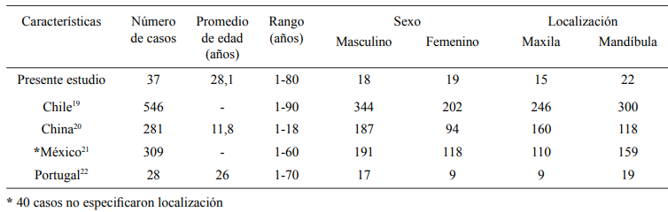 En la tabla 6 se pueden ver las características de los quistes dentígeros en cuanto a edad, sexo y localización más frecuente, comparando la presente investigación con otras investigaciones de distintas partes del mundo.