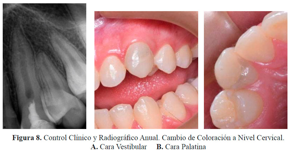 Al cumplirse el año post tratamiento el paciente acude a la cita para su control, este presentaba clínicamente la pieza dentaria funcional y asintomática, observándose que el cambio de color era el mismo que se vio a los 10 meses a nivel cervical, a las pruebas de vitalidad pulpar y a la palpación del fondo del vestíbulo da respuestas de normalidad, radiográficamente se evidencia desarrollo, formación normal y completa a nivel radicular (figura 8).