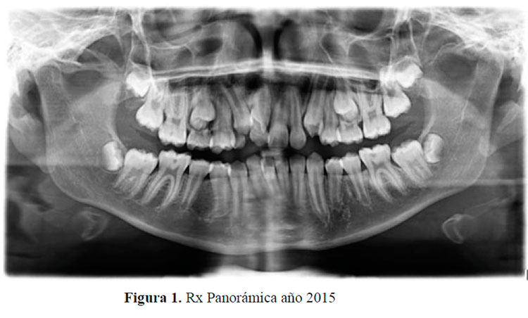 Mientras se valoraban los exámenes radiográficos en la base de datos del paciente se observa una Rx Panorámica del año 2015 (figura 1) tomada por motivos ortodónticos en donde se evidencia que la pza 23 que estaba iniciando su proceso eruptivo presentaba un defecto de tipo PEIR (figura 2) muy pocas veces reportado en un canino permanente maxilar, este defecto ha provocado el posterior desarrollo de una lesión cariosa en dicha pieza dentaria.