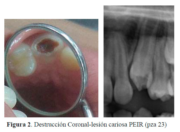 Paciente de 13 años y 10 meses de edad, que acude al Servicio de Odontopediatría de la Clínica dental docente de la Universidad Peruana Cayetano Heredia (UPCH), sede San Martín, por presentar dolor exacerbado a los estímulos térmicos (calor y frío) y a la masticación, En una siguiente visita el dolor se manifiesta de forma espontánea, por tal motivo es remitido al servicio de endodoncia de la UPCH para evaluación, plan de tratamiento y pronóstico del canino permanente superior izquierdo (pieza 23). En la pieza 23 clínicamente se evidencia una lesión cariosa amplia, y tanto el paciente como su padre mencionan que la pieza dentaria presenta un defecto desde el momento de su erupción, pero no fue evaluado por un especialista, por lo cual se descarta el hecho de una fractura coronaria o caries posterior a la erupción.