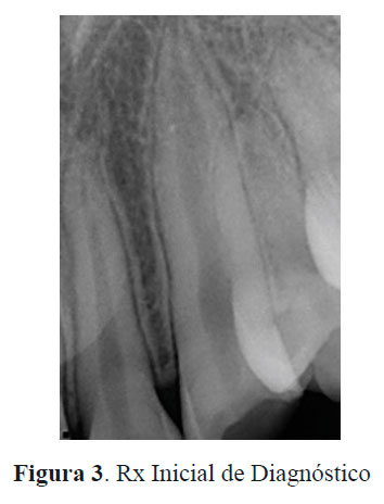 Al cambio térmico da respuesta positiva moderada (++), a la percusión vertical da respuesta negativa (figura 1 y figura 2). Radiográficamente se evidencia IRL c/lesión cariosa con aparente compromiso pulpar y ápice abierto, estadio de desarrollo radicular 9 de Nolla (figura 3). El diagnóstico de la pieza dentaria 23 fue pulpitis reversible sintomática y periodonto sano. Se recomendó hacer la remoción de tejido cariado convencionalmente y de producirse una exposición pulpar realizar el tratamiento de apicogénesis una vez obtenido el consentimiento de los padres, el cual tiene un pronóstico favorable.