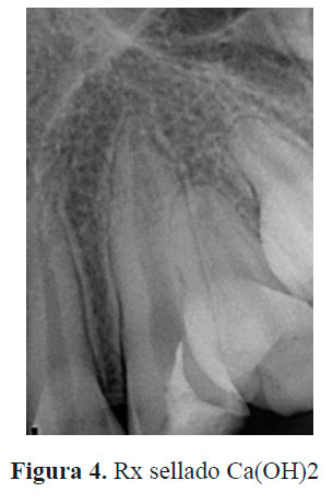 Teniendo en cuenta, que la pieza dentaria al momento de la evaluación ya se encuentra erupcionada, el tratamiento es el de remoción de caries convencional, el cual se inició con anestesia local (lidocaína al 2% con epinefrina), aislando con dique de goma, y al realizar la eliminación de la lesión cariosa por urgencia, se generó una exposición pulpar amplia, por lo cual se decidió realizar una pulpotomía total y recubrimiento directo del remanente pulpar con Ca(OH)2. El acceso y la eliminación completa de la lesión cariosa se realizó con fresa redonda de diamante de alta velocidad estéril; se hizo la pulpotomía, y la asepsia de la cavidad con clorhexidina al 2%; el sangrado fue controlado con una torunda de algodón estéril humedecida con solución anestésica de lidocaína al 2% con epinefrina 1:80.000, se ejerció presión suave por 2 a 5 minutos. Luego de esto, se colocó Ca(OH)2 (ApexCal®, Ivoclar Vivadent) por un lapso de una semana y se selló con ionómero de vidrio (figura 4).