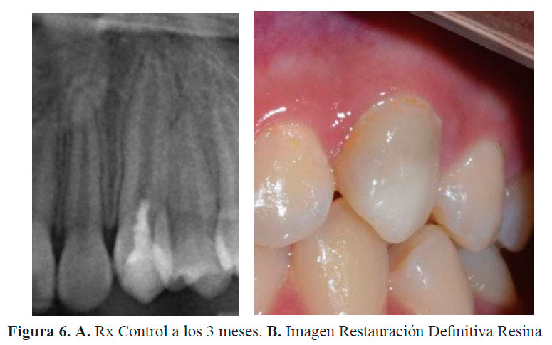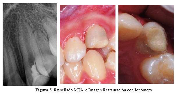 En la segunda cita el paciente llego completamente asintomático, se procedió a colocar anestesia infiltrativa de lidocaína al 2% con epinefrina 1:80.000, aislamiento absoluto, asepsia y antisepsia, remoción de la restauración de ionómero de vidrio, remoción de hidróxido de calcio, irrigación con clorhexidina al 2%, se colocó MTA (MTA ANGELUS®), el mismo que para su preparación se siguió las instrucciones del fabricante, y la mezcla se colocó en la entrada del conducto radicular con un espesor de 3-4 mm aproximadamente (figura 5) y se compactó con un condensador. Para el fraguado del material se colocó una bolita de algodón humedecida por un intervalo de 15minutos y se colocó ionómero de vidrio como sellado coronal (figura 5). Se efectúo una cita de control al mes, el paciente llegó asintomático, se le ejecutó la valoración clínica, evidenciando respuesta de normalidad a la palpación del fondo del vestíbulo, la percusión vertical y horizontal, finalizando la fase endodóntica correctiva (figura 6).