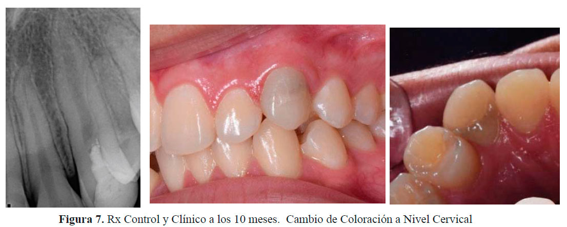 El paciente fue transferido al servicio de Odontología Restauradora y Estética (ORE) para la restauración definitiva, regresó a su control de 3 meses y se comprobó que el diente estaba funcional y asintomático (figura 6). El paciente regresa a los 10 meses posteriores a su tratamiento para el control clínico y radiográfico observándose cambio de coloración grisáseo a nivel cervical y formación radicular normal y cierre apical completo (figura 7).