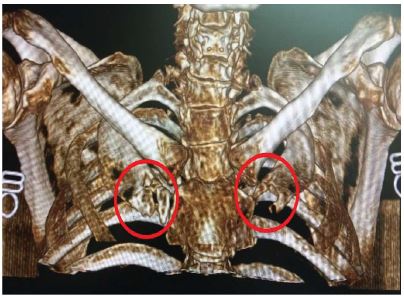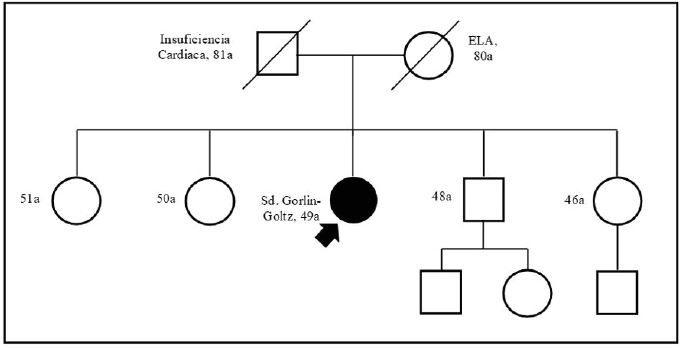 El servicio de Genética Médica, elabora el heredograma (figura 1), indicando que no cuenta con antecedentes familiares, además, presenta defectos congénitos óseos, y concluye que el cuadro clínico es compatible con SGG, que es originado por gen autosómico dominante, probable mutación de novo (no hay hermanos afectados); asimismo, concluye que para detectar el gen se requiere estudios de biología molecular que no se realizan en el país.