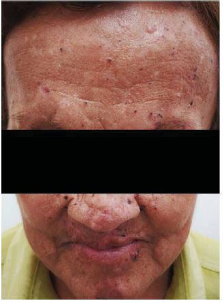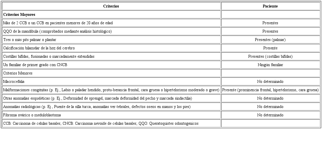 Paciente de sexo femenino de 63 años, mestiza y procedente de Lima, con antecedente de SGG, sometida a múltiples intervenciones quirúrgicas desde los 23 años de edad: exceresis de múltiples nevos basocelulares en región frontal, labial y orbitaria, realizadas por los servicios de Cirugía de Cabeza y Cuello, Dermatología, y Oftalmología; y exodoncias, enucleación y curetaje de QQOs múltiples en los cuatro cuadrantes de ambos maxilares (todas las lesiones fueron confirmadas mediante estudio anatomopatologico), realizados el año 2007 por el servicio de Cirugía Bucomaxilofacial. A los dos años se reporta recidiva de los QQOs en el maxilar superior izquierdo y cuerpo con extención a rama mandibular derecha, por lo que es sometida nuevamente a enucleación y curetaje, además de ostectomia periférica de estas lesiones.