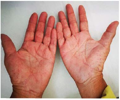 Al examen físico se evidencia fascie característica, prominencia frontal, parietal y arcos superciliares, hipertelorismo, puente nasal ancho, cicatrices cutáneas múltiples en regiones frontal, orbitaria, nasal, labial, y mentoniana, secuela de exéresis de nevos basocelulares, hiperpigmentaciones faciales múltiples, de bordes irregulares (figura 2); en palmas de ambas manos se identificaron múltiples pits (figura 3).
