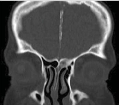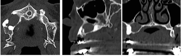 La tomografía helicoidal multicorte revela calcificación de la hoz del cerebro (figura 4), costilla bífida (figura 5). A nivel de los maxilares se observa imagen isodensa localizada en maxilar superior derecho, de forma ovalada, bordes definidos y corticalizados, presentando el adelgazamiento de la cortical ósea vestibular. Descripción imagenológica compatible con QQO (figura 6).