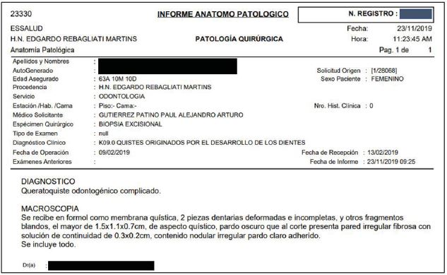 Se envía la muestra al Departamento de Anatomía Patológica del Hospital Nacional Edgardo Rebagliati Martins para el análisis correspondiente, el estudio histológico confirmó que el diagnóstico definitivo fue Queratoquiste Odontogénico (Figura 8).