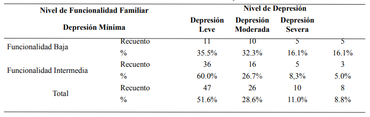 Al comparar los niveles de depresión con los niveles de la funcionalidad familiar, se obtuvieron los siguientes resultados: