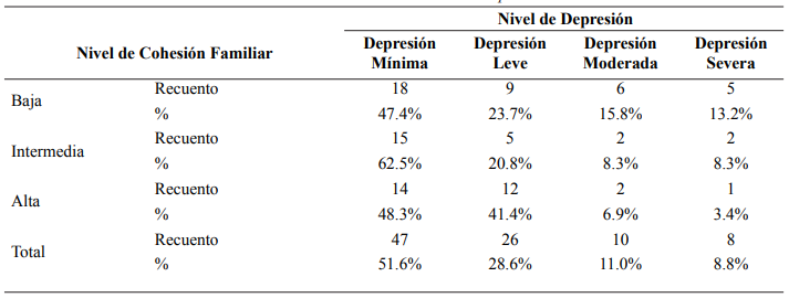 Al comparar la asociación entre la cohesión familiar y los niveles de depresión se encontró que de los 38 sujetos que tenían cohesión familiar baja, 47,4% mostraron depresión mínima, 23,7% depresión leve, 15,8% depresión moderada y 13,2% depresión severa. Por otra parte, de los 22 sujetos investigados que indicaron cohesión familiar intermedia, 62,5% mostraron depresión mínima, 20,8% depresión leve, 8,3% depresión moderada y 8 , 3 % depresión severa. Además, de los 29 investigados que indicaron cohesión familiar alta, 48,3% mostraron depresión mínima, 41,4% depresión leve, 6,9% depresión moderada y 3,4% depresión severa.