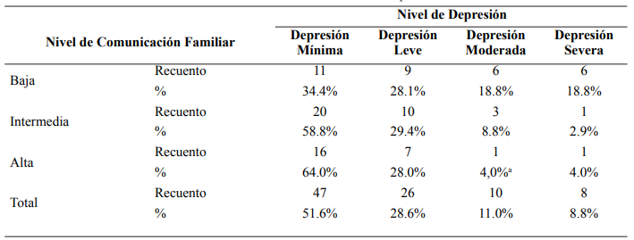 La contrastación de las dimensiones comunicación familiar y la satisfacción familiar son dos variables que mostraron una mayor incidencia en los niveles de depresión del grupo investigado (tabla 4,5).