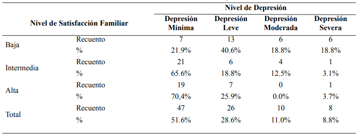 De los 91 sujetos evaluados, el 51,6% tuvo depresión mínima, 28,6% depresión leve, 11% depresión moderada y 8.8% depresión severa. Además, de los 31 sujetos que mostraron funcionalidad baja, el 35,5% tuvo depresión mínima, 32,3% depresión leve, 16,1% depresión moderada y 16,1% depresión severa. Por otra parte, de los 60 sujetos que mostraron funcionalidad intermedia, el 60% tuvo depresión mínima, 26,7% depresión leve, 8,3% depresión que, a menor nivel en la funcionalidad familiar habría mayor nivel de depresión en los adolescentes evaluados (tabla 1).
