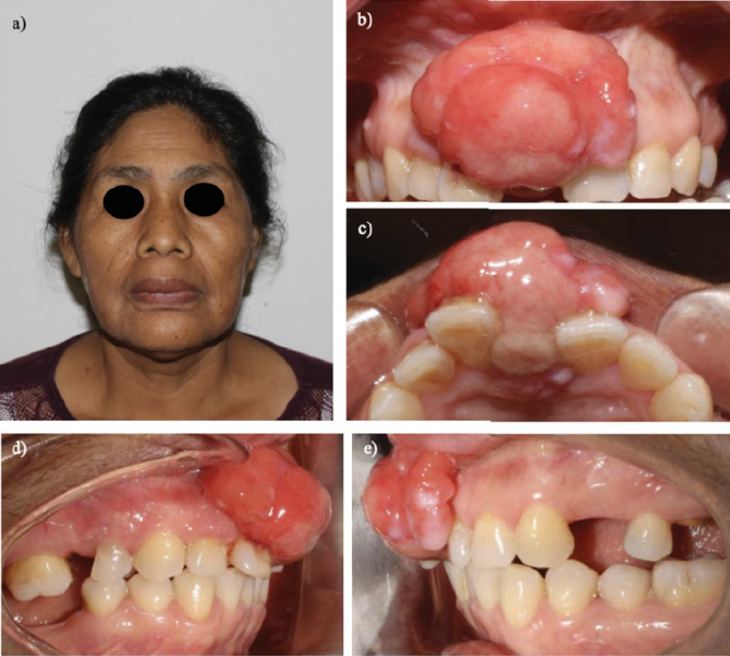 Paciente de sexo femenino de 54 años, mestiza y procedente de Lima niega, antecedentes sistémicos, alergias a medicamentos. Acude el año 2013 por presentar una lesión en el proceso dento alveolar antero asuperior (pre-maxila) en zona de piezas 12, 11 y 21, de 4x3x2cm, al servicio de Cirugía Oncológica del Hospital Nacional Cayetano Heredia, donde retiraron la lesión y fue enviada a estudio anatomopatológico he informan que no es una lesión neoplásica. Cuatro años después ingresa al Servicio de Cirugía Bucomaxilofacial de la Clínica Dental Docente Cayetano Heredia por un aumento de volumen en la región anterior del maxilar superior de crecimiento lento, asintomático y tiene dificultad al masticar.