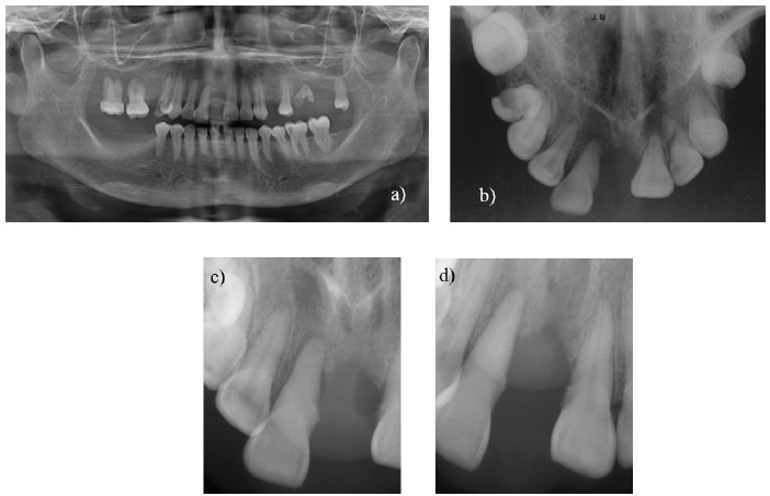 A la evaluación de las radiografías digitales panorámica, oclusal y periapicales se observa que las piezas 13, 12, 21 y 22 presentan ensanchamiento del espacio para el ligamento periodontal. En la pieza 13 se aprecia el aumento del grosor de la lámina dura. La pieza 11 se encuentra extruida con borramiento de la lámina dura perirradicular, y un defecto óseo angular severo mesial con extensión hacia el tercio radicular apical. Así mismo, se evidencia un defecto óseo entre las piezas 11 y 21 con alteración en el trabeculado óseo y disminución de la densidad del hueso alveolar. Signos radiográficos que llevan a la sospecha de una lesión en tejido blando vs. una lesión maligna que ocasiona saucerización y desplazamiento distal de las piezas 11 y 21 (figura 2).