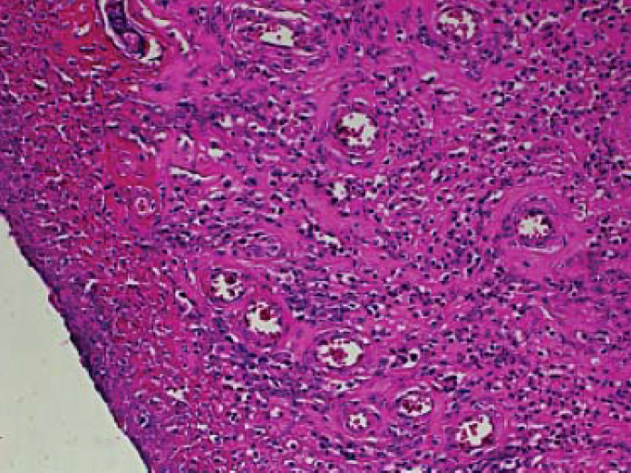 El estudio anatomopatológico reveló al examen macroscópico, que el tejido estaba fijado en formol y mide 1,8x1,5x1 cm, de color blanquecino, consistencia firme, superficie irregular. Al examen microscópico, las secciones estudiadas muestran proliferación de vasos capilares pequeños y mediano calibre congestionados, con infiltrado inflamatorio linfoplasmohistiocitario difuso, distribuidos en tejido conectivo fibroso laxo. Se observa áreas de hemorragia y otras de colagenización. El epitelio de la superficie se encuentra adelgazado y con zonas de ulceración parcialmente con fibrina. El estudio histológico confirmó que el diagnóstico definitivo fue granuloma piógeno descrito como un épulis (figura 4).