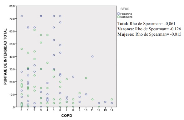 El análisis de asociación entre los niveles de CPOD y los niveles de impacto en la calidad de vida mostraron que hay una asociación inversa entre estas dos variables, por lo que los pacientes con mayor nivel de caries tienen menor impacto en sus actividades diarias y los pacientes con menores índices de CPOD manifestaron los niveles mayores de impacto, lo que se puede explicar debido a que quienes tienen mayor cantidad de piezas cariadas, o son resistentes al dolor y malestares ocasionados por una mala salud bucal o simplemente se adaptaron y por ese motivo no están motivados a mejorar su condición de salud bucal (gráfico 1). En el lado opuesto están los pacientes que tienen mejor salud bucal y que al tener alguna condición que perciben, les genera impacto en su calidad de vida, por lo que es esperable que busquen atención dental y esta motivación podría frenar el avance del proceso de deterioro de la salud bucal.