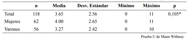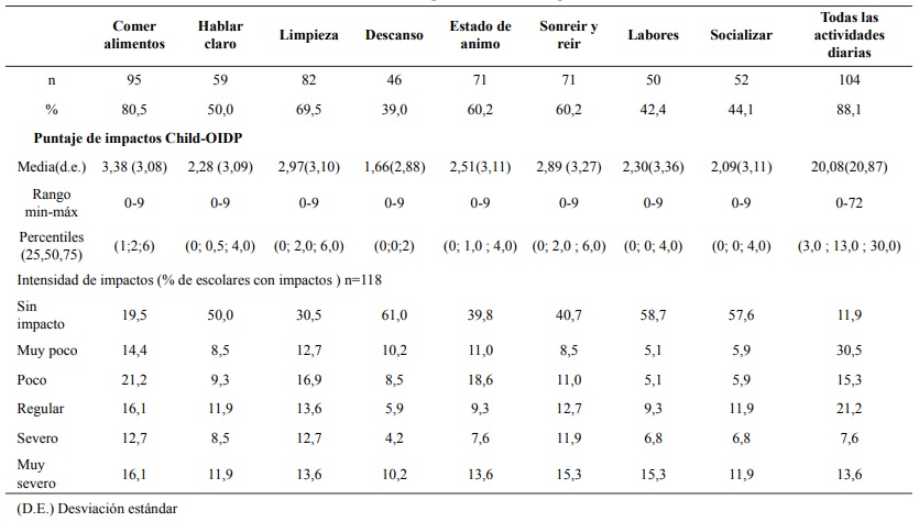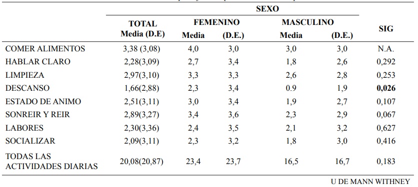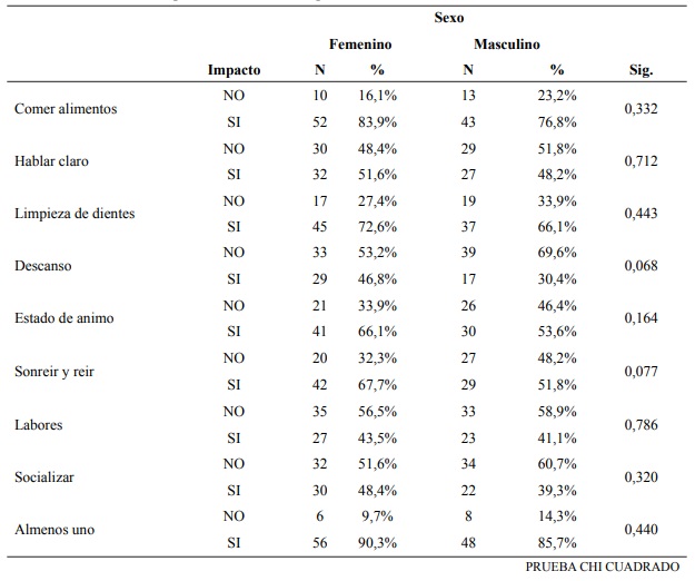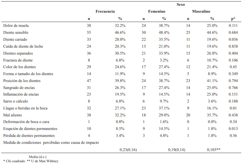 Respecto a la variable impacto en los desempeños diarios, el 88,1% indican tener al menos un desempeño impactado, los desempeños con mayor prevalencia de impacto fueron comer alimento y realizar la limpieza de los dientes con 80,5% y 69,5% respectivamente (Tabla 1). En cuanto a la variable condiciones que causan impacto en la salud bucal, encontramos que las condiciones más frecuentes fueron diente sensible en el 46,6% de los pacientes, de igual forma el dolor de muela y mal aliento se presentaron en el 32,2%. Al comparar las condiciones de acuerdo con el sexo, solo se encontró diferencia estadísticamente significativa en llagas o heridas en la boca, siendo más frecuente en las mujeres (p=0,01) y erupción de dientes permanentes, con ventaja en las mujeres (p=0,013) (Tabla 2). Al comparar el impacto en cada desempeño de acuerdo a sexo, no se encontró diferencia significativa en ningún caso (tabla 3). En promedio los pacientes estudiados tienen 3,65 desempeños afectados, al comparar este promedio mediante la prueba U de Mann Withney entre varones y mujeres no se encontró diferencia estadísticamente significativa (tabla 4). Al evaluar el puntaje de impacto en cada desempeño se encontró que el más afectado fue el de comer alimentos, seguido por el de limpiarse los dientes. A pesar de que el impacto en el desempeño dormir no es uno de los más frecuentes, si se encontró diferencia estadísticamente significativa entre varones y mujeres p=0,026; comprobado mediante la prueba U de Mann Withney (tabla 5).