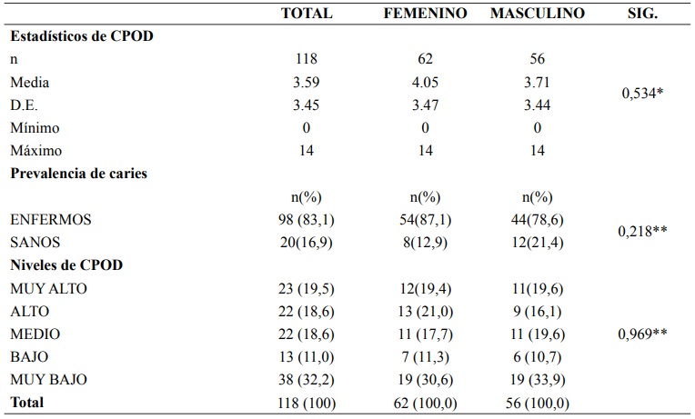 En cuanto a la variable caries, la prevalencia fue de 83,1% y no se encontró diferencia estadísticamente significativa entre varones y mujeres. El promedio de CPOD en la muestra total fue de 3,89 (D.E. 3,45) lo cual indica que hay una gran variación de los datos y a pesar de que las mujeres presentan un promedio más elevado esta diferencia no fue estadísticamente significativa al valor encontrado en varones (U de Mann Withney). De igual forma la prevalencia de caries activas en la muestra total es elevada (83,1%) y a pesar de que existe una diferencia de 9% de prevalencia entre varones y mujeres está no es estadísticamente significativa (Chi cuadrado). Respecto a los niveles de caries, el 38% de los pacientes estudiados tienen niveles entre Alto y Muy alto. De igual forma no hubo diferencia al comparar la distribución de frecuencias de los niveles de experiencia de caries entre varones y mujeres mediante la prueba estadística Chi cuadrado (tabla 6).