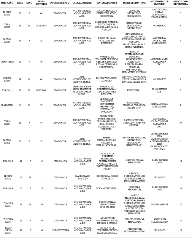 Limitando la búsqueda a publicaciones en odontología de reportes de enfisema subcutáneo desde el 2009 hasta el 2018, como una continuación de la compilación realizada de McKenzie WS y Rosenberg M. Como criterios de inclusión, se consideraron las publicaciones sobre procedimientos quirúrgicos orales (1).