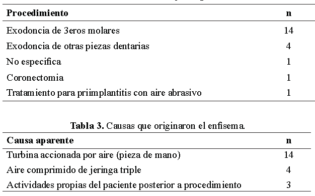 Se encontró que 14 de estos casos estaban asociados a procedimientos quirúrgicos de exodoncia de terceros molares. De los restantes: 4 por exodoncia de otras piezas dentarias y solo 1 caso no específica la pieza a la cual se le hizo la exodoncia. Asimismo se encontró 1 caso reportado por coronectomia de tercera molar y 1 caso asociado a tratamiento con aire abrasivo para peri-implantitis con dispositivo escaler. (tabla 2).