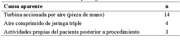 Se pudo determinar además que 14 de los 21 casos estaban relacionados con el uso de turbina accionada por aire. Otros casos incluyeron: 4 por el uso de aire comprimido de la Jeringa Triple y 3 por actividades del paciente después del procedimiento quirúrgico. (tabla 3)