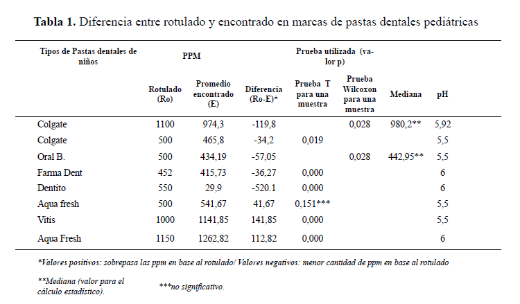 Se encontró que tres de pastas dentales presentaron un promedio menor al valor mostrado en el rotulado (Colgate de 1100 ppm , Farma Dent de 452 ppm, Dentito de 550 ppm), dos pastas dentales presentaron una mediana menor al valor mostrado en el rotulado (Colgate de 1100 ppm, Oral B de 500 ppm), dos pastas dentales presentaron un promedio mayor al valor mostrado en el rotulado (Vitis de 1000 ppm, Aqua Fresh de 1150 ppm), y, una pasta dental, si bien presentó un promedio mayor al presentado en el rotulado, no fue significativo como en los anteriores casos (Aqua fresh de 500 ppm).