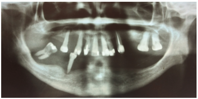 En la radiografía panorámica se observó pérdida ósea generalizada debida a enfermedad periodontal, sin áreas de erosión a nivel de las lesiones, leve radiopacidad correspondiente a las masas tumorales en el primer, tercer y cuarto cuadrantes (Figura 4).