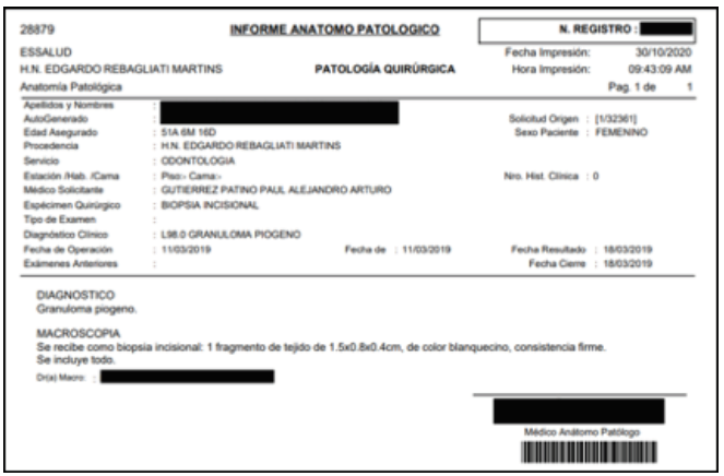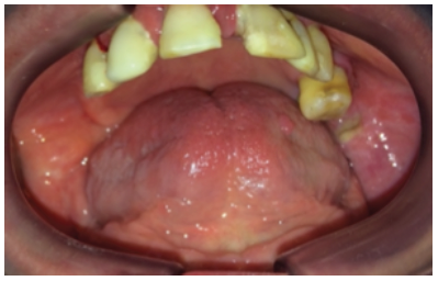 Al examen clínico extraoral se observó placas costrosas descamativas en piel de todas las regiones faciales. Al examen intraoral, apertura bucal conservada, higiene oral deficiente, movilidad dentaria generalizada, encías edematosas, congestivas, en el primer cuadrante se evidenció lesión tumoral lobulada, de forma regular, bordes definidos, ulcerada, base sésil, color violáceo, de aproximadamente 2.5 x 2.5 cm, asociada a pieza 1,5, la cual presentaba movilidad grado II-III; en el tercer cuadrante, edentulo, se evidenció lesión tumoral lobulada, de forma regular, bordes definidos, ulcerada, base sésil, color violáceo, de aproximadamente 1.5 x 1 cm; y en el cuarto cuadrante lesión tumoral lobulada, de forma regular, bordes definidos, ulcerada, base sésil, color violáceo, de aproximadamente 1 x 0.6 cm, asociada a piezas dentarias 4,5 y 4,8, las cuales presentaban movilidad dentaria grado II-III (Figura 1,2,3).