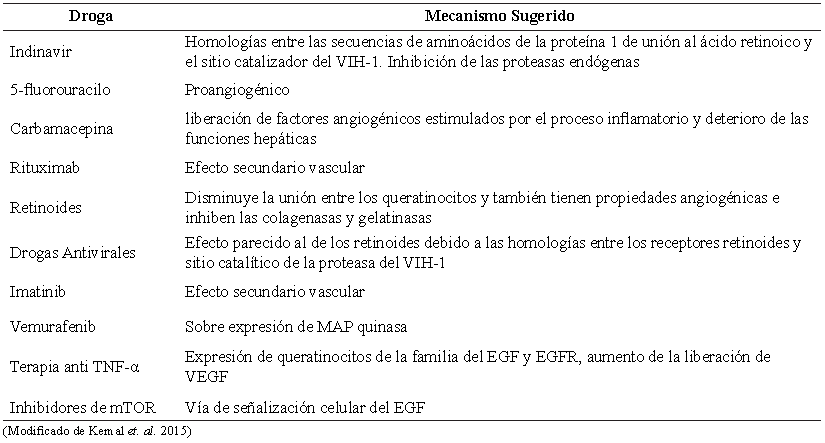 Las drogas son una causa bien conocida de desarrollo de GP, están relacionados en su mayoría con el uso de retinoides, agentes antirretrovirales, inhibidores del receptor del factor de crecimiento epidérmico (EGFR), y drogas antitumorales (14), en la tabla 1 se presenta el mecanismo de acción de una serie de drogas que inducen a la formación de GP. En la revisión de la literatura, solo fue reportado un caso de GP cutáneo (subungueal) múltiple asociado al uso de Levotiroxina (14), aunque fue de localización extraoral, las características clínicas e histopatológicas son similares.