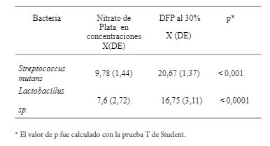 En la tabla 1, observamos que el DFP al 30% y el NP en diferentes concentraciones, tuvo efecto sobre las cepas bacterianas estudiadas, esto podría deberse a que dichas sustancias inhiben específicamente las proteínas que descomponen la matriz orgánica de la dentina expuesta: metaloproteinasas de la matriz (6); catepsinas (7); y bacterias colagenasas; además el DFP supera a otros agentes cariostáticos en el arresto de las bacterias cariogénicas a nivel de los túbulos dentinarios. (8)