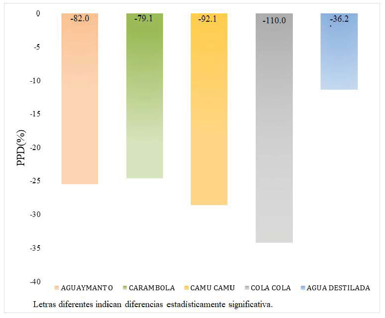 Se emplearon las siguientes bebidas: Physalis Peruviana (aguaymanto), Averrhoa Carambola (carambola), Myrciaria Dubia (camu camu), Coca cola® (control positivo) y agua destilada (control negativo). Para la preparación de los jugos de frutas se seleccionaron frutas maduras y en buen estado. Se lavaron en agua corriente y luego se secaron a temperatura ambiente. Para la preparación de los jugos se utilizaron 100 ml de pulpa de fruta con 200 ml de agua destilada desionizada, en una proporción 1:2 dando un total de 300 ml de jugo (23). Las bebidas se mantuvieron a temperatura ambiente y se utilizaron el mismo día (13).